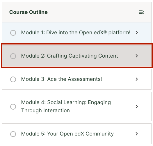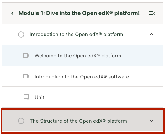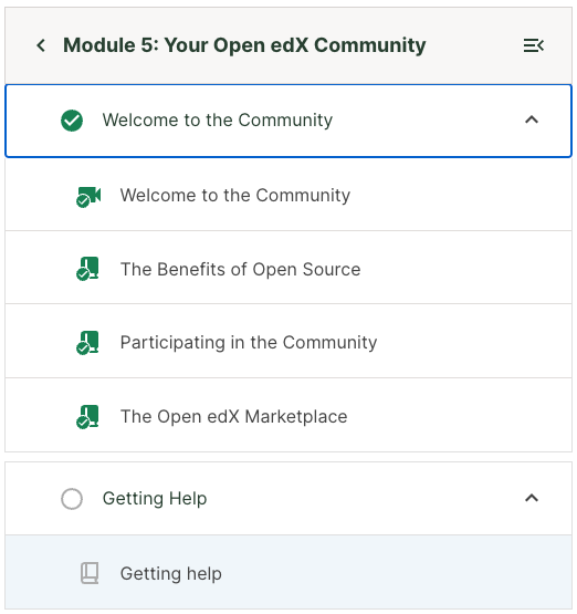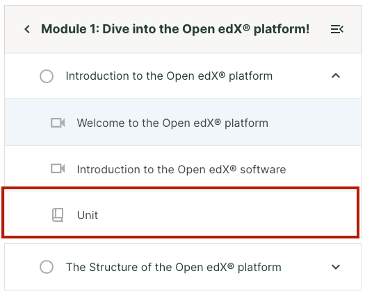 Additionally, learners can easily navigate the course non-linearly without having to go to the Course Outline page. Learners can click on any unit in the sidebar to view that unit. The sidebar displays both the unit name and an icon indicating the type of content in that unit. The idea is to give the learner a fuller sense of what content exists where in the course, so that they can navigate it in a way that makes sense for them.
