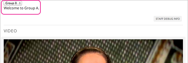 When you view a unit that contains a content experiment in the LMS Staff view, you can select one of the experiment groups from a drop-down list. The unit page then shows the content as the selected group of learners sees it.