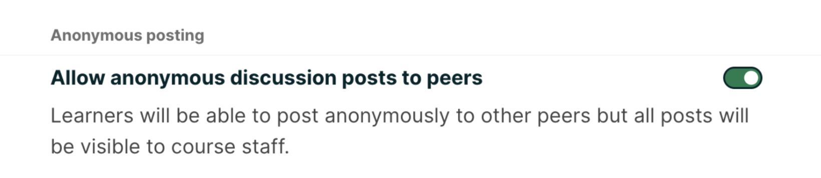 2. Toggle the Allow anonymous discussion posts to peers to enable learners to make posts that are anonymous to everyone other learners.