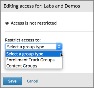 The access settings dialog for a component, with a dropdown list for selecting the type of learner group you will use for restricting access.