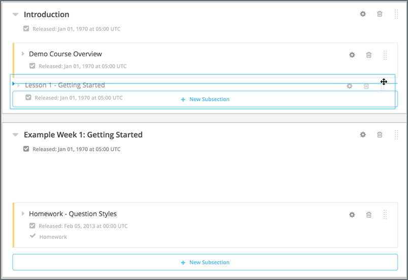 If you did not expand the section or subsection you are moving the object to, the outline of that section or subsection turns blue when you have moved the object to a valid location. You can then release the mouse button. For example, in the image below, the subsection Lesson 1 - Getting Started is being moved to the collapsed section Introduction.