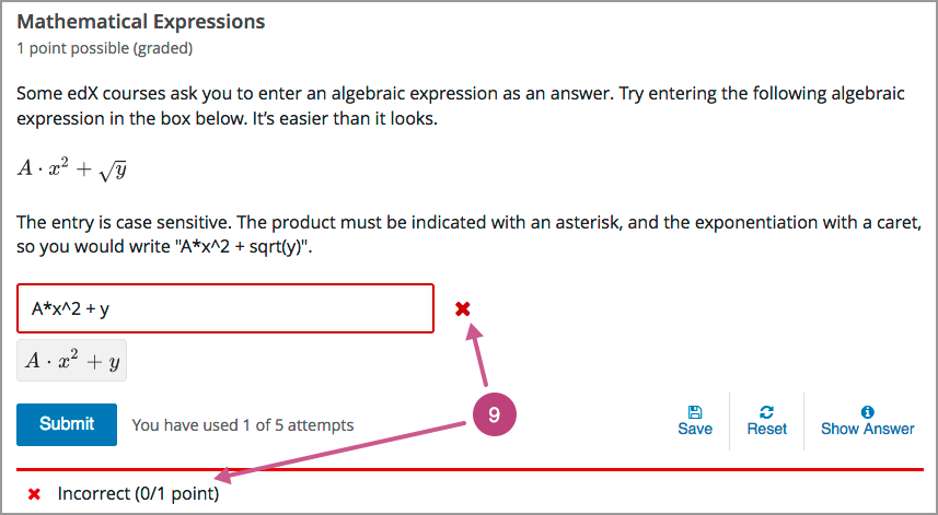 Submit. When a learner selects Submit to submit a response for a problem, the LMS saves the grade and current state of the problem. The LMS immediately provides feedback about whether the response is correct or incorrect, as well as the problem score. The Submit option remains available if the learner has unused attempts remaining, so that they can try to answer the problem again.