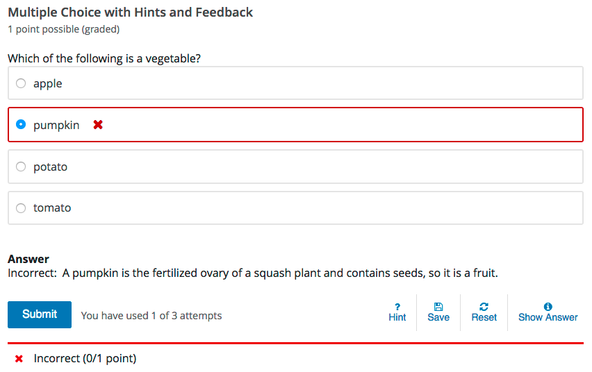 For example, the following single select problem provides feedback in response to the selected option when the learner selects Submit. In this case, feedback is given for an incorrect answer.