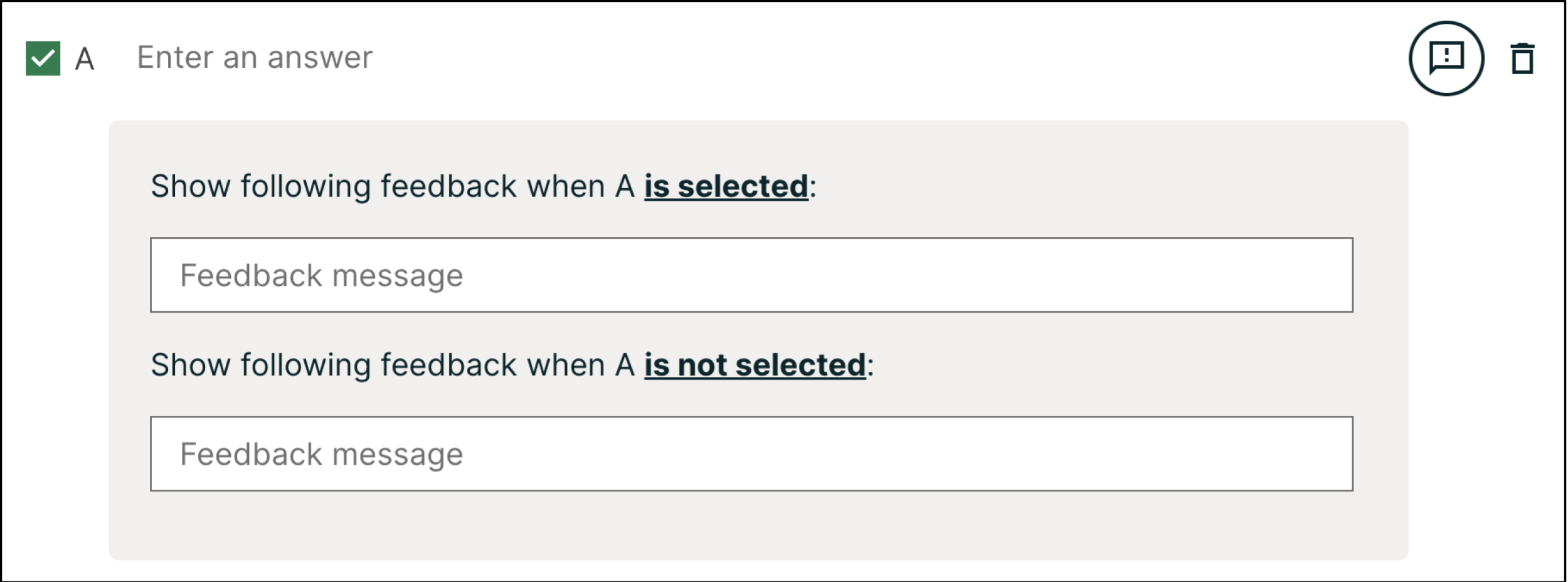 Answer-specific feedback can be added under each answer by pressing the feedback icon to the right of the answer text. Feedback entered in these fields are given when the learner selects that answer or when the learner does not select that answer.