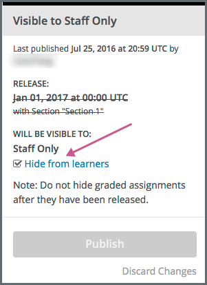 Learners never see a unit with the publishing status Visible to Staff Only. For more information, see Hide a Unit from Learners.