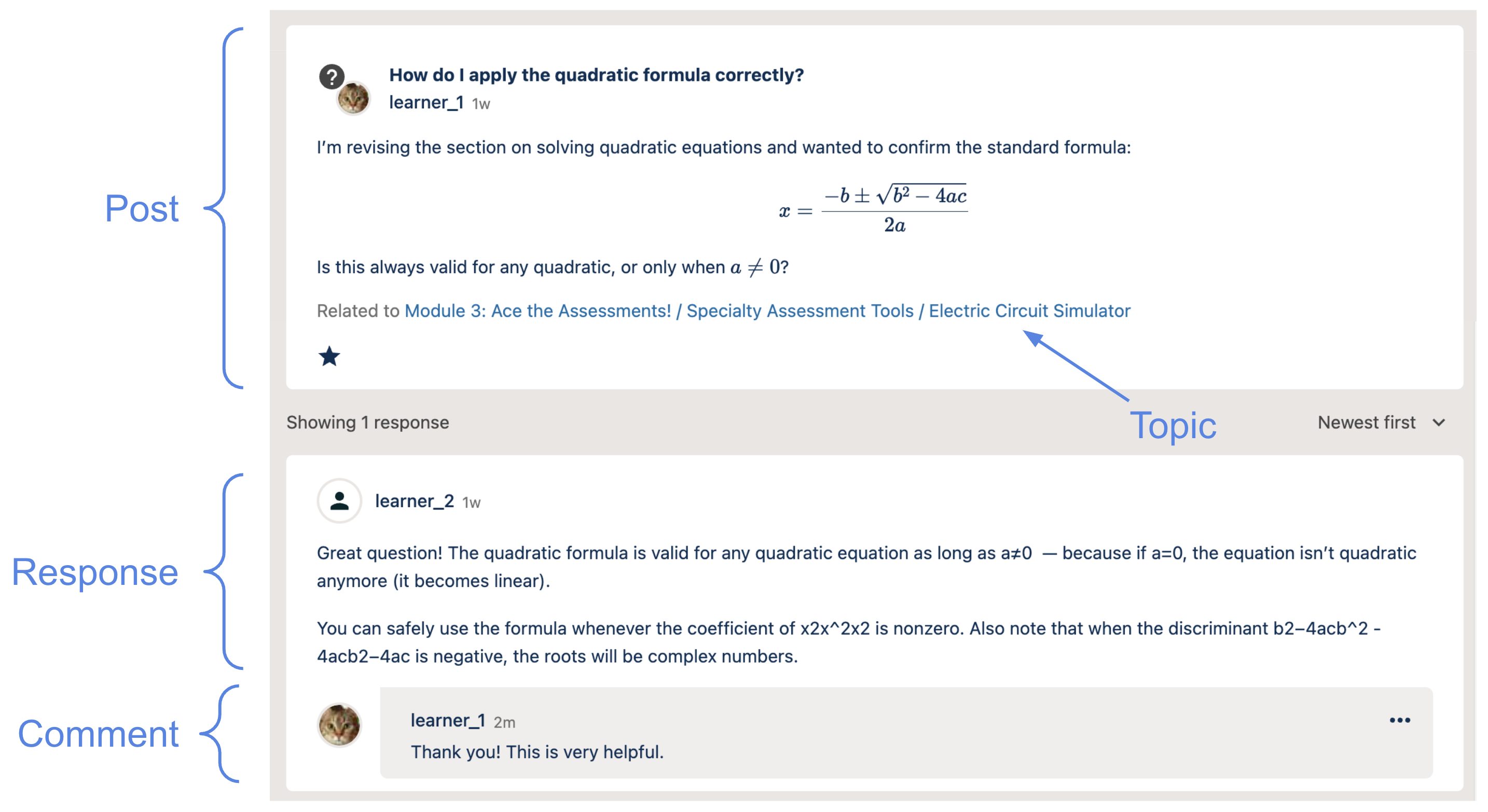 Response: Other learners or course staff can write responses to a post. Responses add explanations, share experiences, or suggest solutions. They sit directly under the original post.